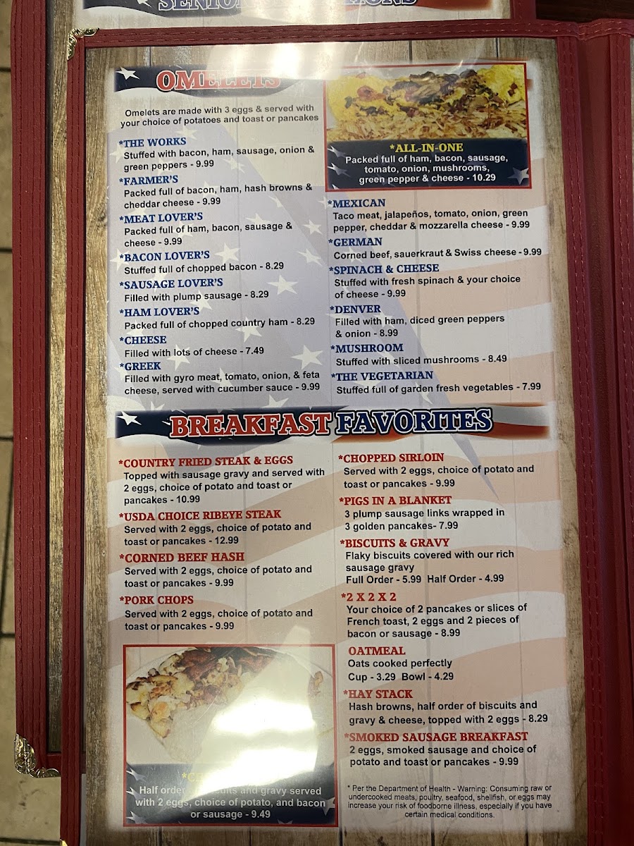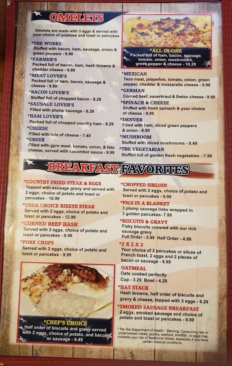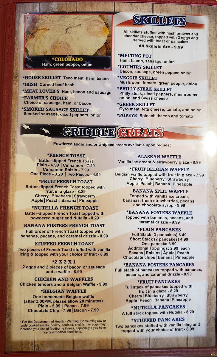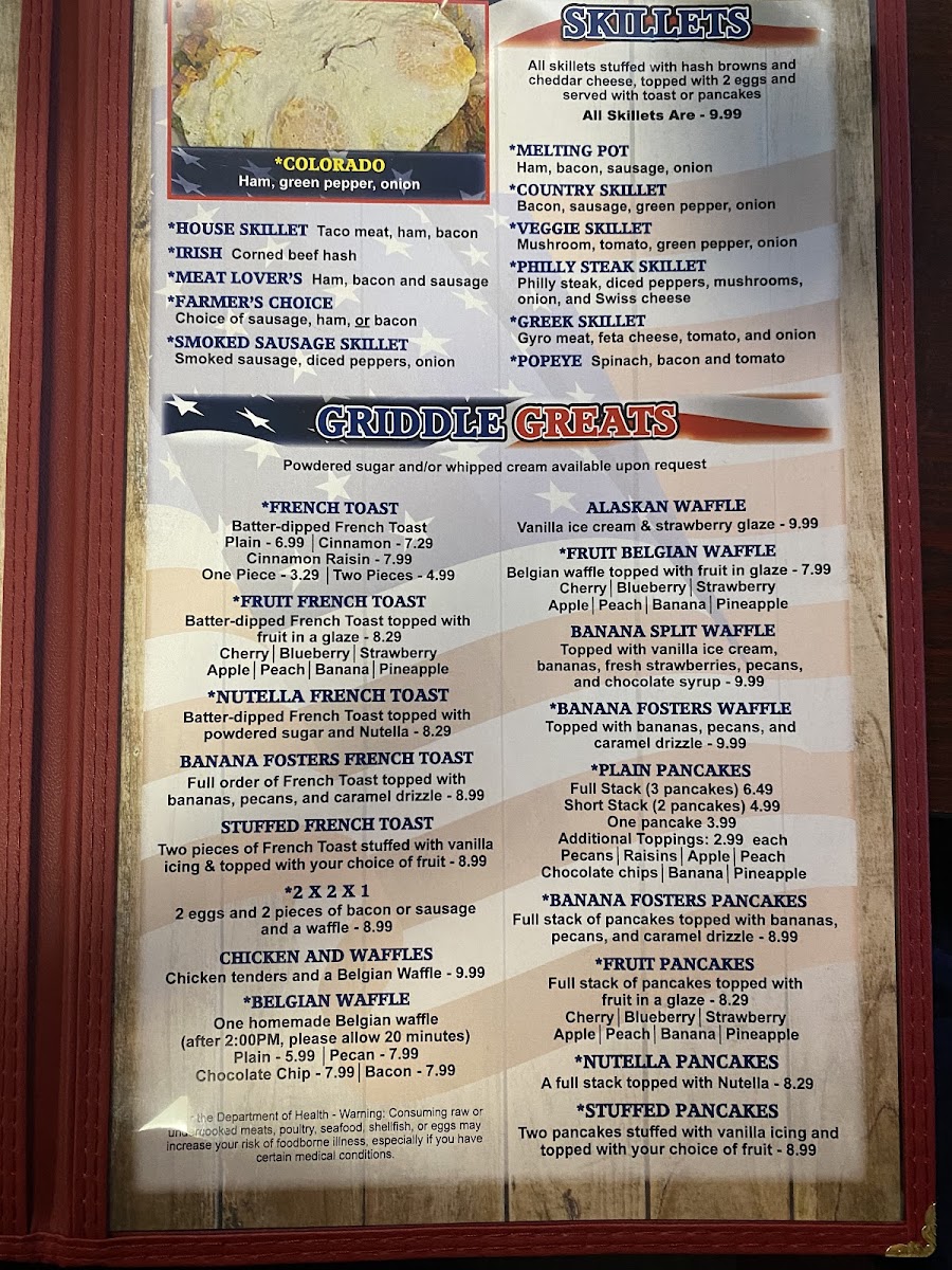 Stuffed with fresh spinach & cheese. Served with choice of potatoes and toast or pancakes. Per the Department of Health - Warning: Consuming raw or undercooked meats, poultry, seafood, shellfish, or eggs may increase your risk of foodborne illness, especially if you have certain medical conditions.
